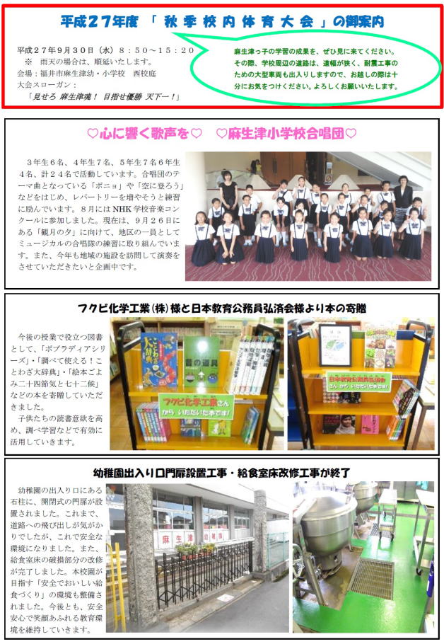 夏休みが終わり、8月31日(月)に授業が再開されました。福井市は2学期制ですから、1学期は10月8日(木)までになります。保護者・御家族、地域の皆さまには、日頃より本校園の教育活動に御理解と御協力をいただき誠にありがとうございます。お陰さまで、子供たちは元気に1学期後半の学校園生活を無事にスタートさせることができました。