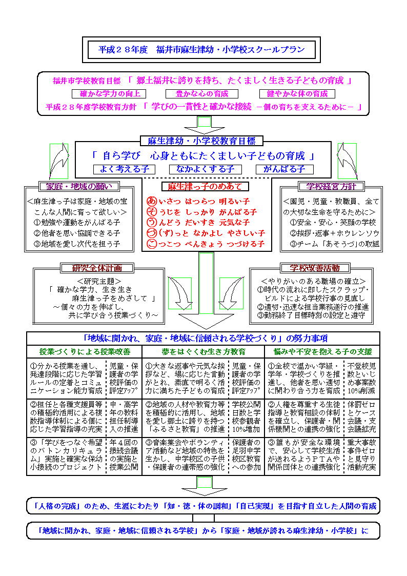 ある学校づくりが必要です。そのため麻生津幼・小学校では「スクールプラン」 に掲げさせていただいたように、「地域に開かれ、家庭・地域に信頼される学