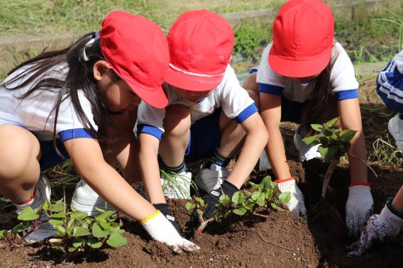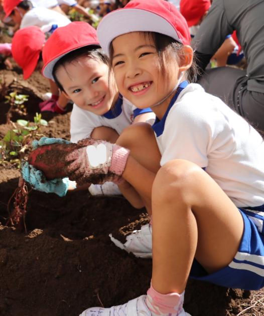 まずは、やさしく、さつまいもの周りの土をどけていきました。少しずつさつまいもが見えてきたところで、お友達と一緒に、さつまいもを引っ張りました。