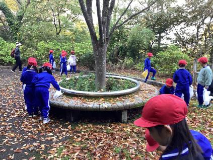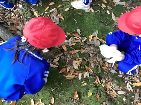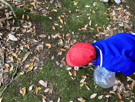 まずは、足羽山で落ち葉や木の実拾いをしました。