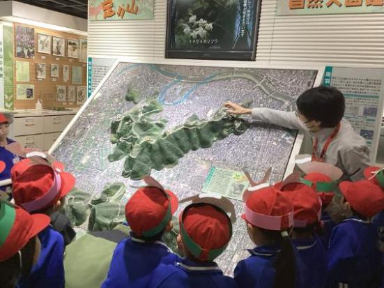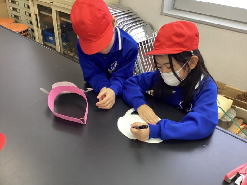 足羽山で見られる虫について学んだ後に、それぞれ虫のお面作りをしました。自分の好きな色を塗って出来上がったお面を見て、どの子も満足そうでした。