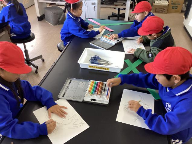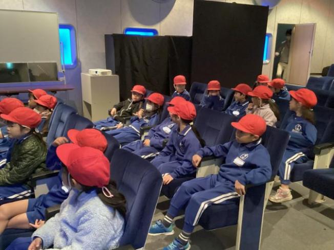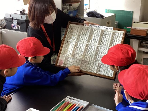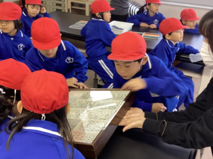 館内のシアターで恐竜の動画を見た後は、施設内を見学しました。福井市で見られる生き物の展示を見たり、石の様子を顕微鏡で見たりして、学びを深めていました。