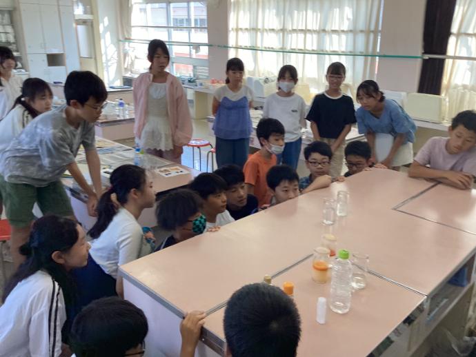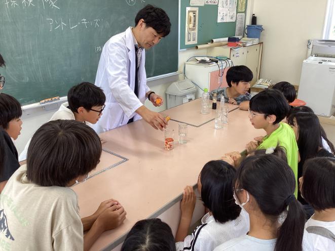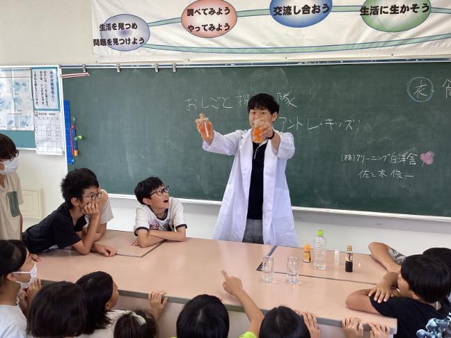まず、洗濯するときに大切な「洗剤」について、水と比べながら演示実験を通して、洗剤が水を染みこみやすくすることや、油などの汚れを混ぜ合わせることができることを学びました。