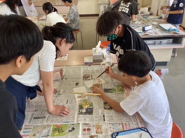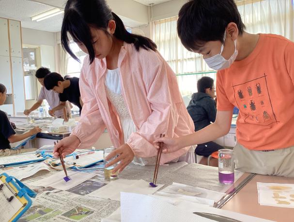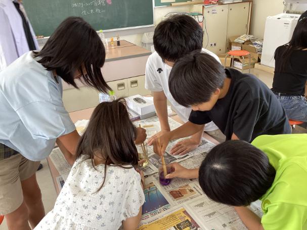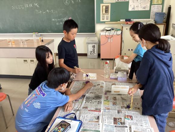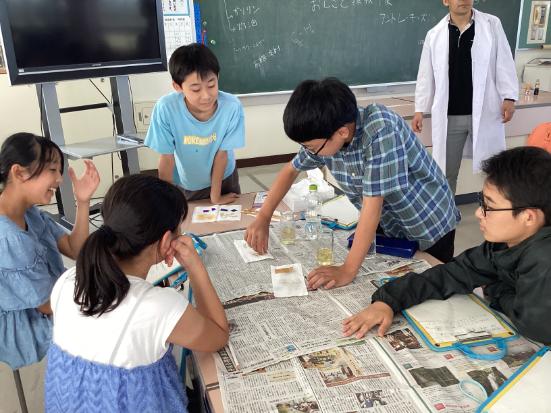 次に、班ごとに、有機溶剤と水それぞれに、汚れた布や染めた布を入れ、どのくらい汚れが落ちるか、どのくらい色落ちするのかについて調べました。洗剤によって得意な汚れがあること、使い分けることで衣服への負荷が少なくなること、色落ちを防ぐことができることなどが分かりました。