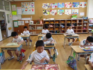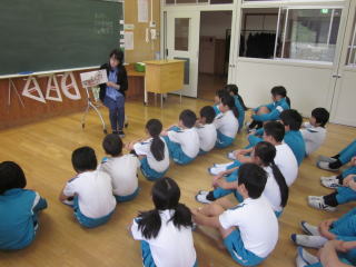 火・木曜日の週2回,朝の時間(ホンゴウタイム)は全校一斉の読書タイムです。ルールは「自分の席で、しずかに」です。の2つ。みんな静かに本に向かっています。木曜日は、図書支援員さんの読み聞かせ、地域ボランティアさんの童話語りがあります。