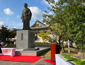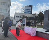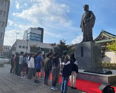 岡倉天心像に献花した後 「天心先生に捧げる詞」を堂々と朗読しました