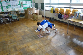 今日は「わくわく雑巾デー」でした。割り当てられた場所をみんなと一緒に雑巾がけしました。水の冷たさと一人に割り当てられている場所の広さに驚いていました。