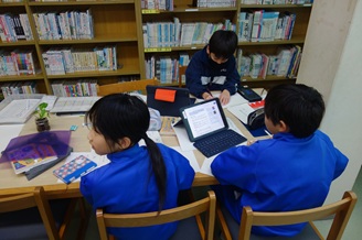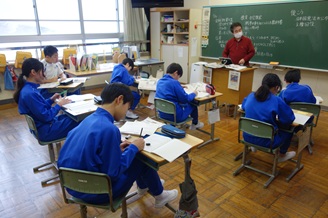 1~4年生は1限目の国語の時間、詩の勉強をしました。1・2年生は「こしの」をテーマに作った詩を清書しました。留学の子の詩には「・・・うみがきれいに見えた うみがザブンと音がした ちょっとたのしかった・・・」と越廼の自慢の海のことが書かれていました。3・4年生は、図書館にある詩集やインターネットを使って、自分のお気に入りの詩集を作りました。