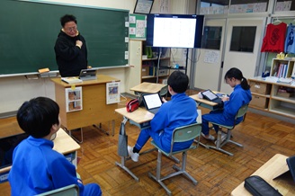 1限目の国語の時間、3・4年生はグループで五感についての話し合い学習を進めました。5・6年生は、偉人の名言についてそれぞれがタブレットでまとめたものを発表しました。