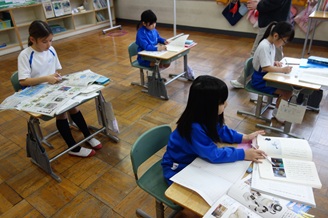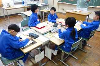2年生は国語の時間、漢字の問題づくりをしていました。「へん」や「つくり」など漢字の構成から問題をつくる子や、新聞を切り抜いて漢字問題をつくる子などいろいろな工夫がありました。
