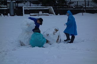 3・4年生は担任の先生を説得して、雪遊びをしました。少し土もついていますが、越廼でも雪だるまを作ることができました。
