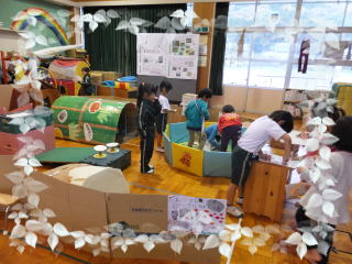 ▼みんなでかんがえよう▼友達と考えを出し合いながら、遊びを考えます。「虫さんみんなのワクワクドキドキひろば」をつくりました。 |
