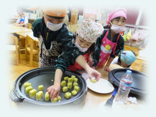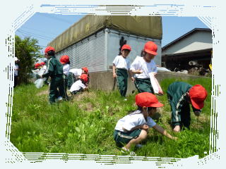 ▼よもぎつみ▼よもぎを摘んでおいしいおだんごをつくったよ! |