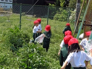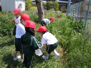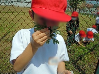 4/26(火)、誕生会のお楽しみクッキングで使うヨモギをつみに出かけました。