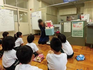 ▲歯のお話と歯みがきの仕方を教えてもらっています。模型を使って分かりやすくお話しして頂きました。