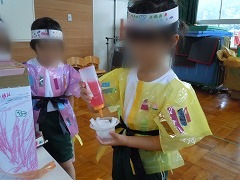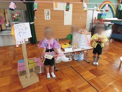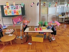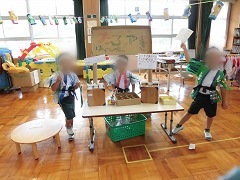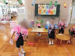 みんなで考えた「おかぼハッピーまつり」。6月25日(土)にはおうちの人、6月29日(水)には保育園さんを招待しました。自分達で相談しあって準備してきたおまつりで、たくさんの人をハッピーにしてとてもうれしそうでした。みんなでできたという達成感が次の活動の意欲につながりました。