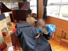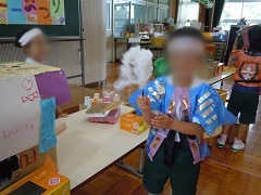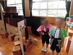| お化け屋敷 見えないようにかくれたり、音を出した りして、おどろかせました。 みんなとてもびっくりしていました。 |