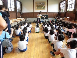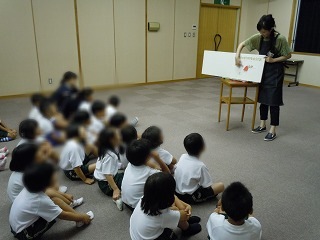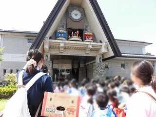 | 午後は、勝山市立図書館に移動して絵本の読み聞かせでした。みんな、静かに聞き入っていました。 また、からくり時計の見学では、人形の動きに、歓声を上げていました。 |