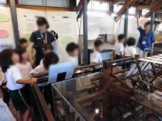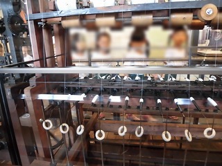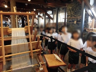 | ▲はじめは、イベントホールで各園の紹介、諸注意、そしてこの施設やカイコについての説明を聞きました。 ▼展示物の見学の様子です。機織り機や、布が織られる様子がよく分かりました。 |