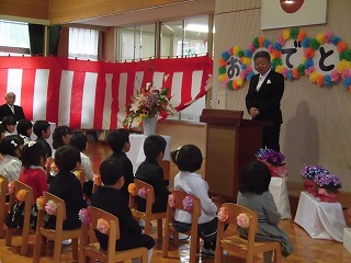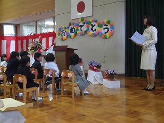 | 担任の大越先生から、一人一人の名前が呼び上げられました。 全員が、大きな声で返事をして立ちました。 今年の新入園児も、元気いっぱいです。 |