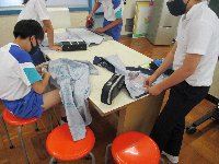 エプロンづくりです。ミシンやアイロンを使って作業しています。