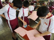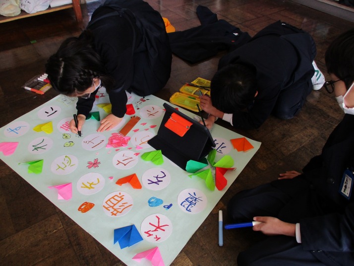 | 2月12日(木) 祝う会の準備 頑張っています。 3年生は、祝う会ではスローガン係。今日はそのときに提示するスローガンに飾り付けをしていました。最近折り紙がはやっているなあと思っていたら、このためだったのですね。かわいく仕上がっていました。 |