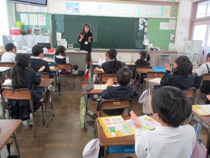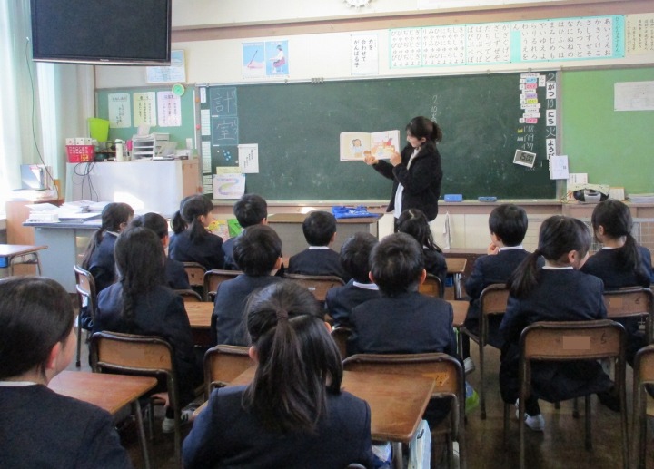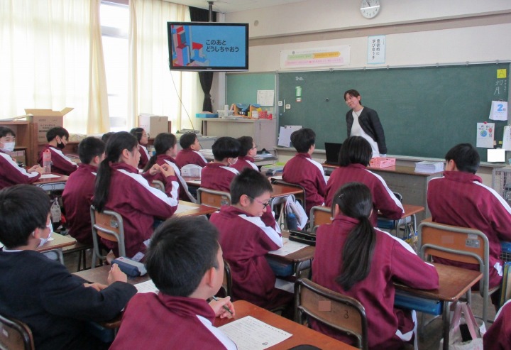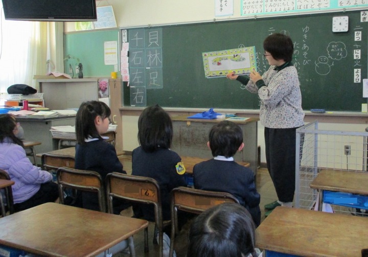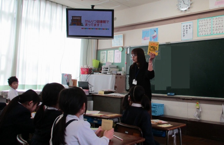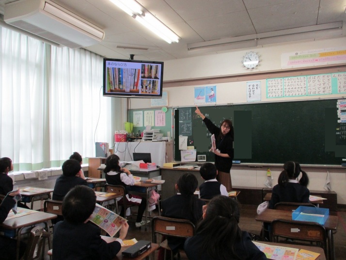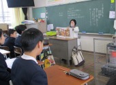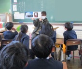 | 2月13日(金) 県立図書館について知ろう。 今日は、県立図書館の司書の方をお呼びして、図書館の施設やしくみ、司書の仕事などを教えていただきました。県立図書館には、110万冊以上あることや、司書の方は本を選んだり並べる場所を考えたり、人と本をつなげたりする仕事をしていることなどを、画像を使いながらわかりやすく教えていただきました。また、手遊びやストーリーテリングなどのしてくださり、楽しく過ごすことができました。 |