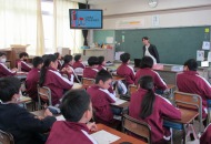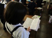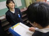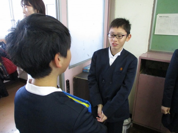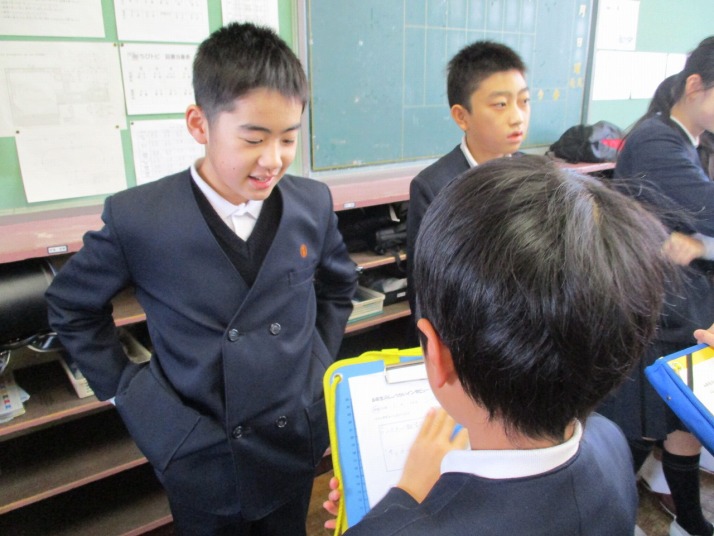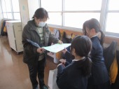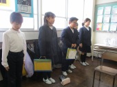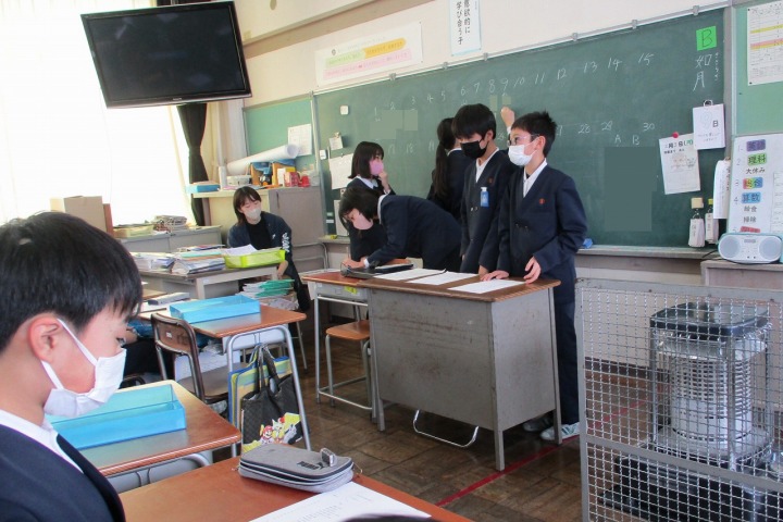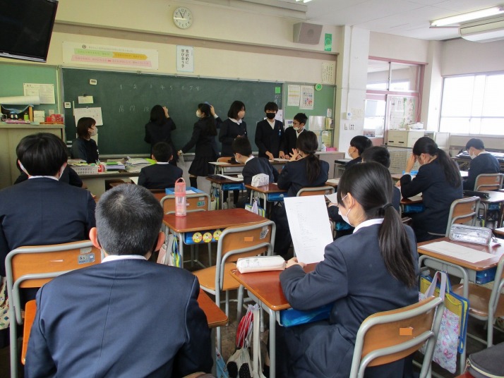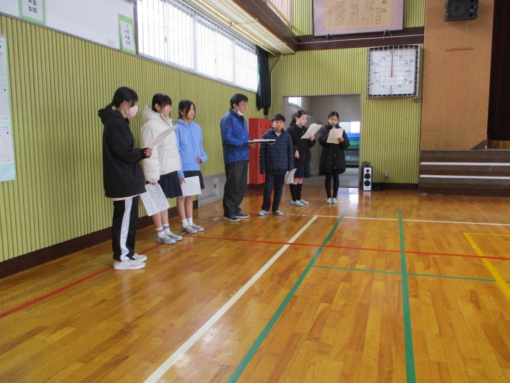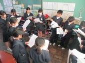 | 2月10日(火) 「卒業を祝う会」に向けて。 各学年が「卒業を祝う会」に向けて準備を進めています。1年生は音楽の時間に歌の練習をしていました。3年生はスローガン唱和の進行をします。各班に分かれて流れを確認していました。 |