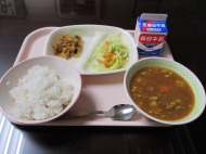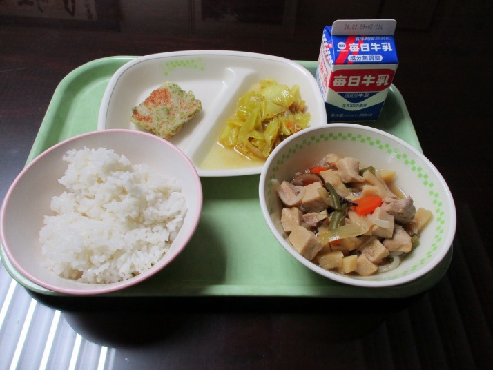 | 2月2日(月) 今日の給食。はんぺんの磯辺揚げ。 今日の給食の献立・・・ご飯、野菜のカレー炒め、はんぺんの磯辺揚げ、高野豆腐の煮物、牛乳。エネルギー668kcal タンパク質 26.1g |