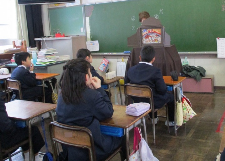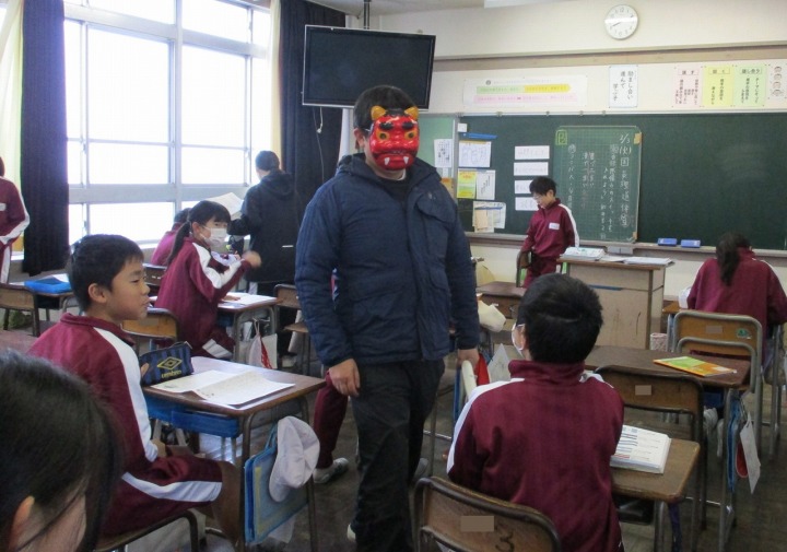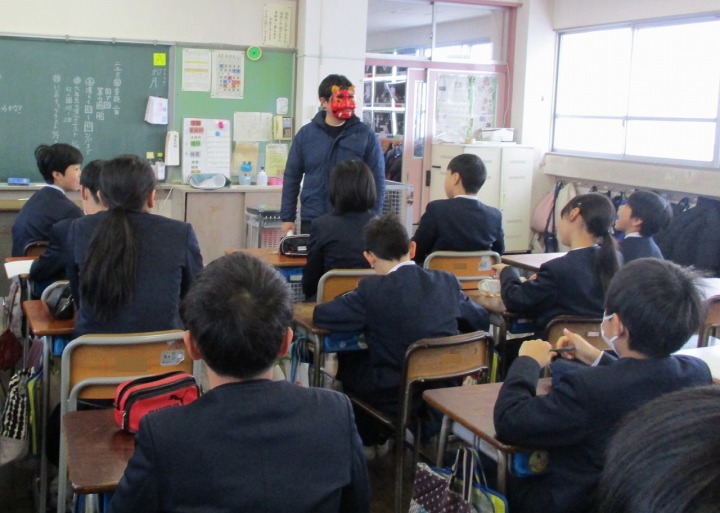 | 2月3日(火) 読み聞かせがありました。 今日は節分。読み聞かせは鬼の出てくる紙芝居「じごくけんぶつ」と、6年生に向けては英語での読み聞かせ「英語落語 まんじゅうこわい」でした。 節分にあわせて、鬼さんも登場しました。 |