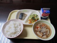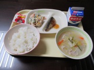 | 2月6日(金) 今日の給食。焼き鯖。 今日の給食の献立・・・ご飯、焼き鯖、キャベツの梅昆布和え、ぼっかけ汁、牛乳。エネルギー599kcal タンパク質 26.5g |