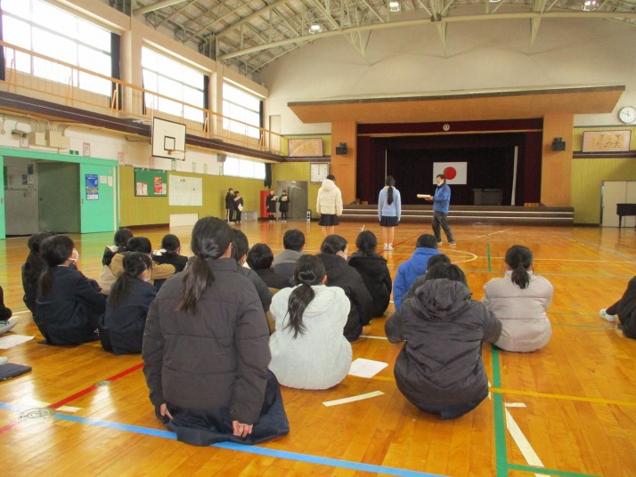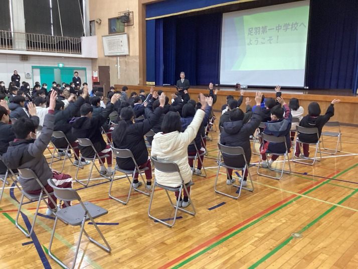 | 2月2日(月) 6年生 一中オープンデーに参加。 中学校入学前に、中学生体験をするオープンデーが足羽第一中学校で行われました。はじめに中学校の校長先生から大谷翔平選手の言葉から3つのお願いの話がありました。その後中学校の授業や部活動などの話を伺いました。最後は、学校対抗レクリエーション。バレーボールの円陣パスやバスケットボールのシュート対決をして楽しみました。卒業式まであと23日。中学校生活も目の前に迫っています。中学校瀬活がイメージできたかな? |