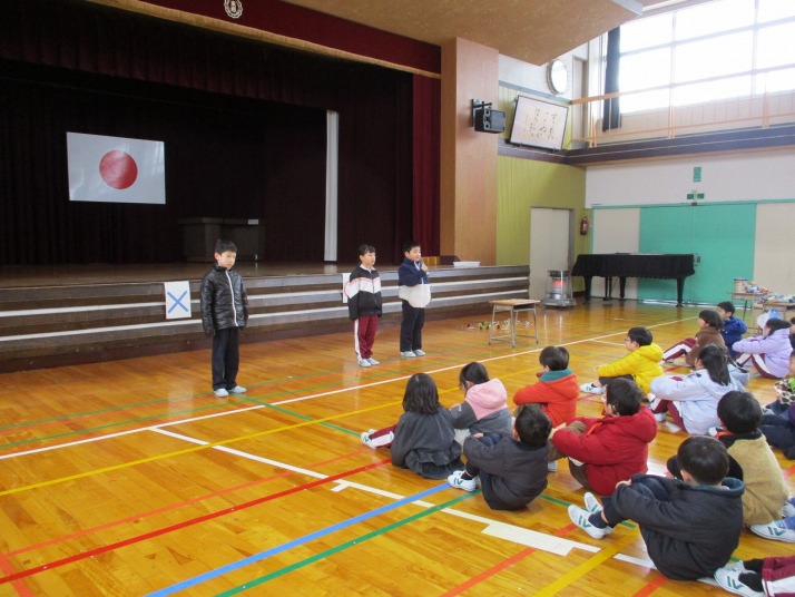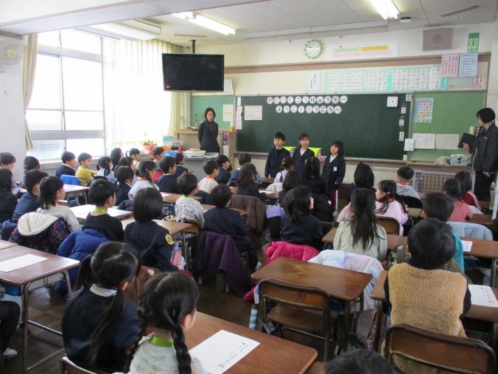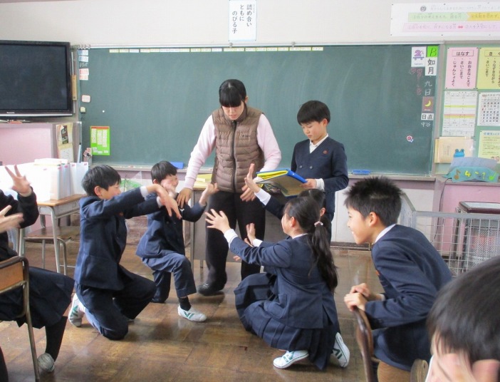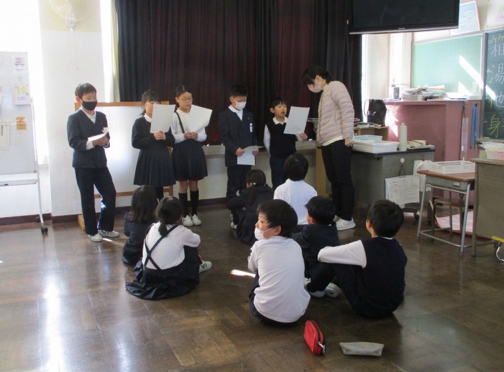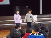 | 2月9日(月) 祝う会の準備進んでいます。 19日に行われる「卒業を祝う会」に向けて各学年は準備を進めています。4年生は、第1部にて6年生の紹介をするため、あらかじめ6年生にインタビューをしたところですが、今日は当日どのように紹介をするのか、台詞や動きを確認し合っていました。 一方6年生は、出し物の役割分担をしていました。リハーサルは、木曜日に行われます。 |