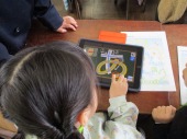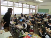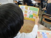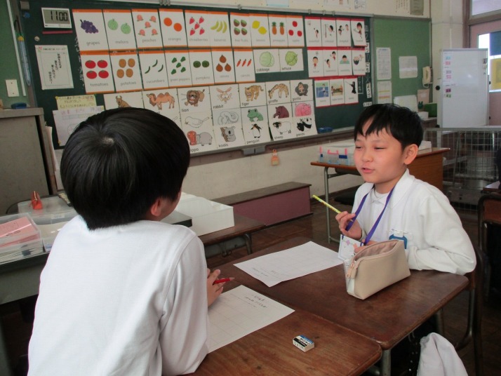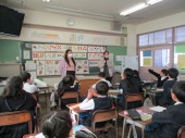 | 2月10日(火) 英語でクイズを出そう。 3年生の英語では、動物や果物、スポーツなどの英単語を学習しました。今日は、黒板に貼ってあるものについて、友達に3つのヒントを出し、何についての説明かを当ててもらっていました。「It's red。」「it's fruit。」「it's small」・・・・「it's strawberry!」 |
