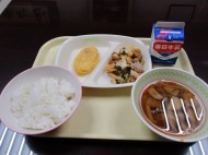| 2月4日(水) 今日の給食。トマトミートオムレツ。 今日の給食の献立・・・ご飯、トマトミートオムレツ、厚揚げと野菜の味噌炒め、のっぺい汁、牛乳。エネルギー626kcal タンパク質 25.4g |