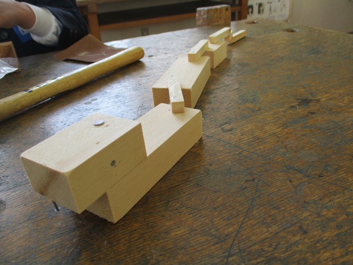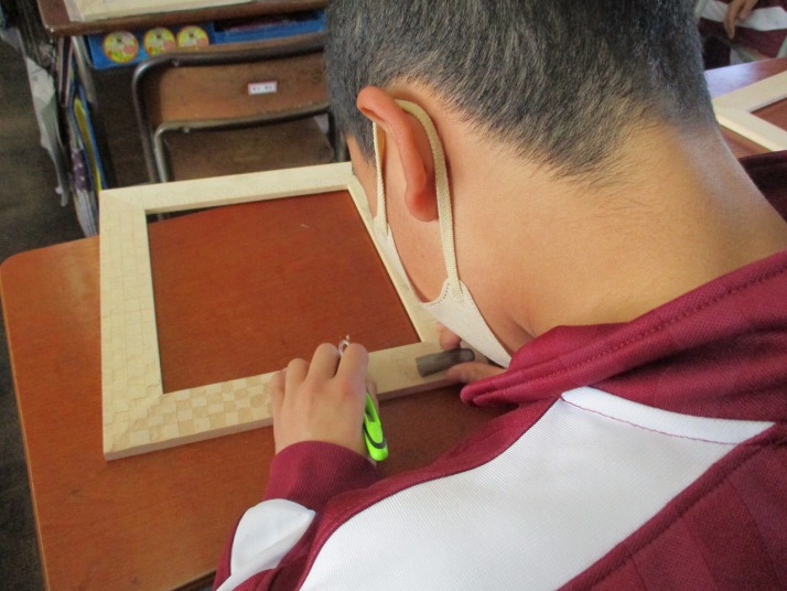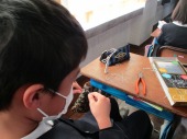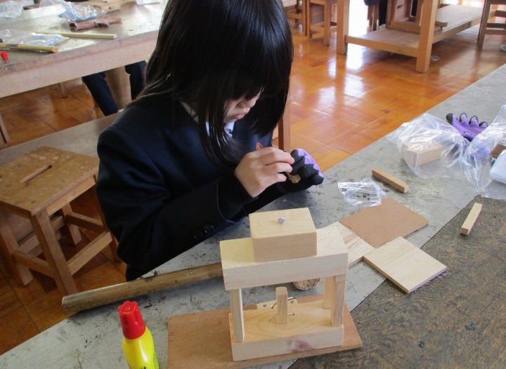 | 2月5日(木) トントンどんどん くぎ打って。 今3年生の図工では、木片にくぎを打って作品に仕上げていく学習をしています。小さなくぎをトントンと打ち付けて思い思いに作品を作っていました。どんな作品が仕上がるのかな? |