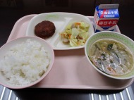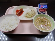 | 2月10日(火) 今日の給食。ウインナーのケチャップソース。 今日の給食の献立・・・ご飯、ウインナーのケチャップソース、ベーコンポテト、白菜スープ、牛乳。エネルギー613kcal タンパク質 24.1g |