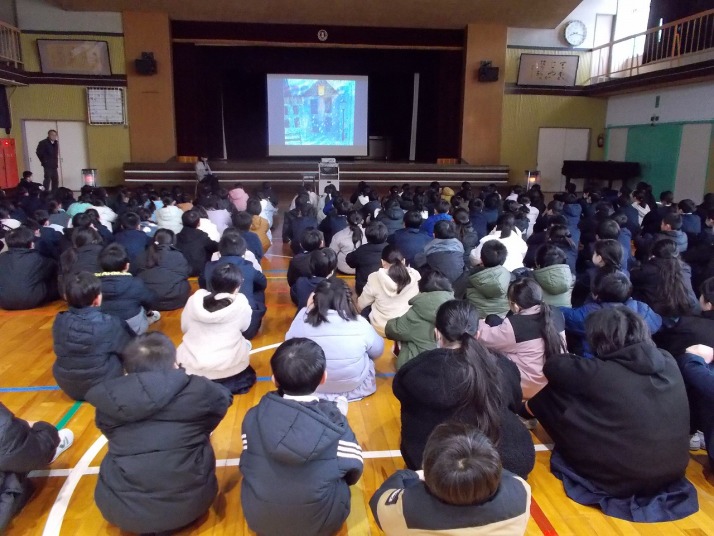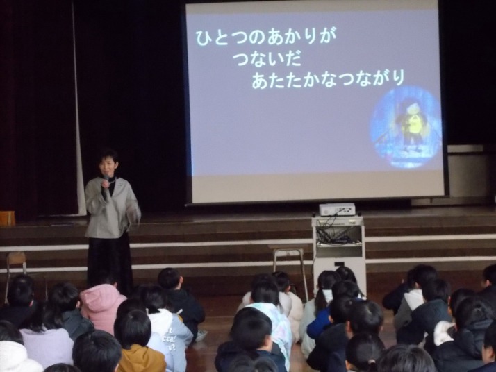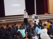 | 2月6日(金) 全校朝礼がありました。 今朝は全校朝礼が行われました。朝礼では、絵本「あかりをひとつともしてみたら」の読み聞かせがあり、「人はみんなとつながっている、一人の言葉や行動がみんなとつながっており、それがみんなでいるということ」との趣旨のお話がありました。 |