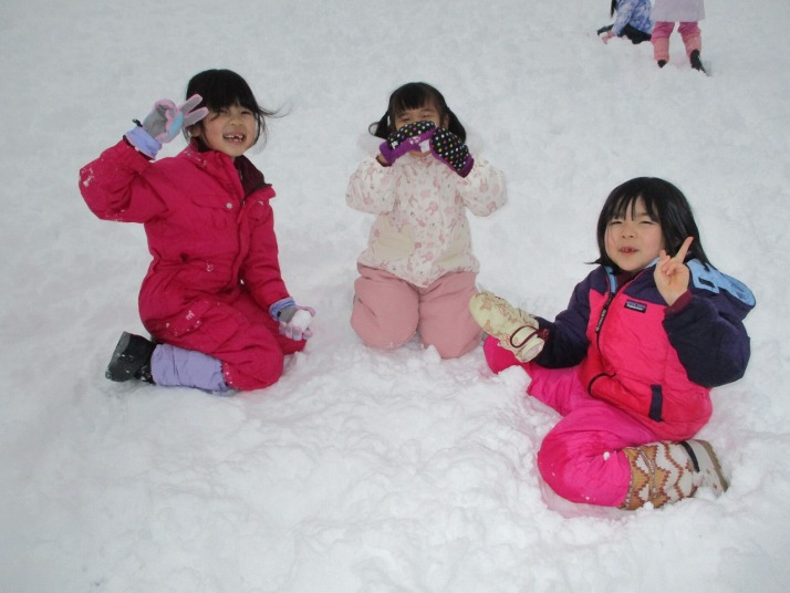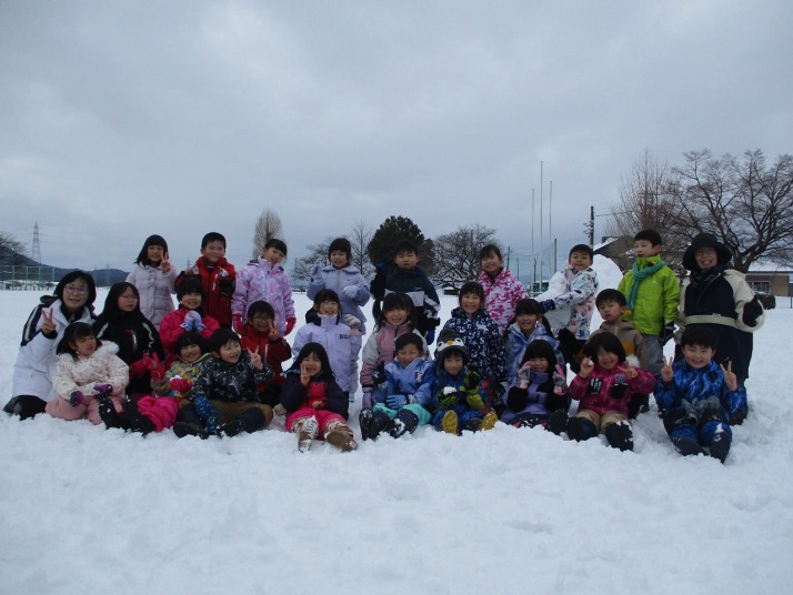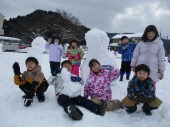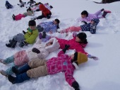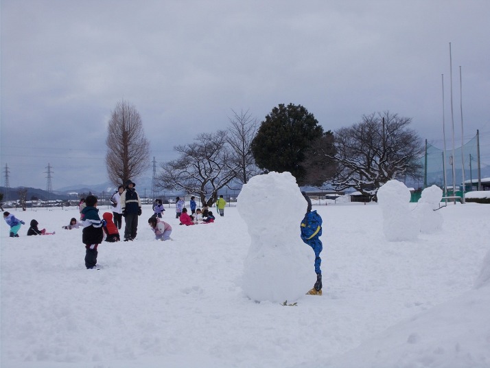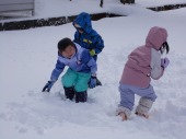 | 2月9日(月) 楽しいね 雪遊び。 昨日から降り出した雪が校庭にたくさん積もりました。1年生は早速雪遊び。朝まで降っていた雪も、1年生が遊ぶタイミングで降り止んでくれ、時にはお日様もかお顔をのぞかせる絶好の雪遊び日和となりました。校庭には大きな雪だるまがたくさん並んでいました。 |