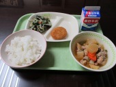 | 2月9日(月) 今日の給食。ふるさと給食。 今日の給食の献立・・・ご飯、ふるさとコロッケ、うららのサラダ、鶏肉と大根のうま煮、牛乳。エネルギー622kcal タンパク質 24.0g |