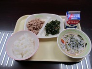 | 2月13日(金) 今日の給食。ビビンバ。 今日の給食の献立・・・ご飯、ナムル、肉いため、ビーフンスープ、牛乳。エネルギー590kcal タンパク質 25.8g |