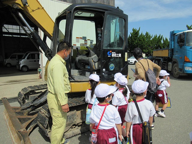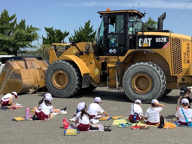 | 5月6日(金) 1年生校外学習 1年生が初めての校外学習に出かけました。地域にある岩佐土建さんで、働く車のお話を聞いて、写生をしました。 働く車のお話や実演では、子どもたちが知っている車も多く、「これはダンプカーだね」「冬に除雪しているのを見たよ」と興奮した様子で話を聞いていました。 その後、ダンプカーが土砂を運び、トラックに乗せるところを見ると、歓声を上げていました。 写生では、自分のお気に入りの車を1台決めて、画用紙いっぱいに描いていました。車の細かいところまでよく見て、色使いを工夫しながら、一生懸命描いていました。 子どもたちのために、たくさんの働く車を準備し、優しくお話をしてくださった岩佐土建のみなさま、本当にありがとうございました。 |