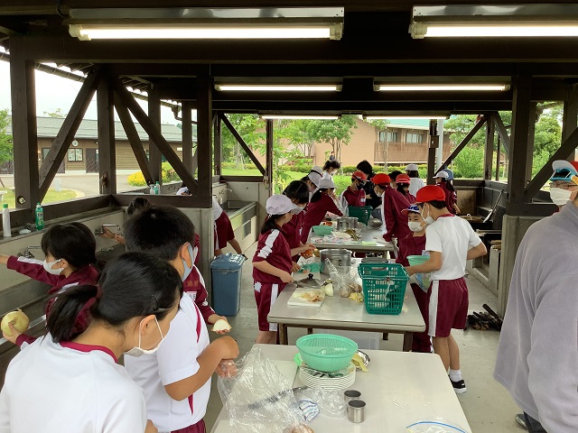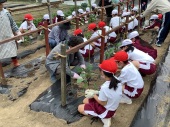 | 5月11日(水) 野菜苗植え 1年生、2年生、3・4組が野菜の苗植えをしました。 子どもたちそれぞれが植えたい夏野菜の苗を選んで植えました。 畑ボランティアの皆さんに植え方を教えてもらいながら、植えた苗が大きく育つように願いを込めて、優しく丁寧に植えていました。 夏にはたくさんのおいしい夏野菜がとれるのが楽しみです。 畑ボランティアの西口さん、伊東さん、角谷さん、宮下さん、草むしりや畝作りを含めて、たいへんお世話になり、本当にありがとうございました。 |