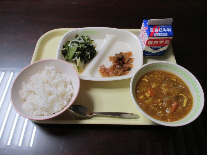 | 12月15日(月) 今日の給食。カレーシチュー 今日の給食の献立・・・麦ご飯、カレーシチュー、海藻サラダ、ふくじんづけ、牛乳。エネルギー 603kcal タンパク質 23.6g |