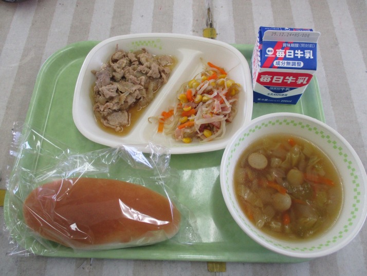 | 12月16日(火) 今日の給食。豚肉のジンジャーソース 今日の給食の献立・・・プラスコッペパン、豚肉のジンジャーソース、もやしとコーンのソテー、野菜たっぷりスープ、牛乳。エネルギー 605kcal タンパク質 28.0g |