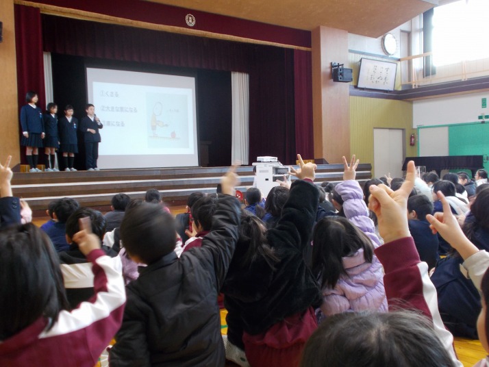 | 12月11日(木) ハーモニー集会、姿勢のお話 今朝のハーモニー集会では、健康委員会から姿勢の話がありました。姿勢が良くないと、むし歯になりやすかったり学習に集中できなかったりするなど、これから成長するに当たって大切な話がたくさんありました。これまでに健康委員の皆さんがしっかり調べプレゼン資料を制作したそうです。とても勉強になりました。これからいい姿勢で過ごしていきましょう。 |