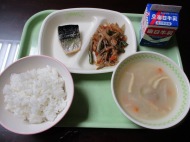 | 12月17日(水) 今日の給食。焼き鯖 今日の給食の献立・・・ご飯、焼き鯖、五目きんぴら、里芋の味噌汁、牛乳。エネルギー590kcal タンパク質 26.6g |