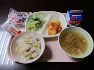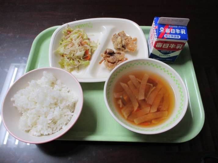 | 12月18日(木) 今日の給食。鶏肉の唐揚げ 今日の給食の献立・・・ご飯、鶏肉の唐揚げ、キャベツの炒め物、けんちん汁、牛乳。エネルギー631kcal タンパク質 24.8g |