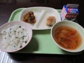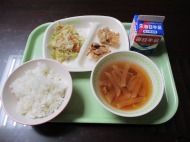 | 12月8日(月) 今日の給食。ちくわのカレーマヨネーズ焼き 今日の給食の献立・・・ご飯、ちくわのカレーマヨネーズ焼き、レンコンの甘辛いため、豆腐の五目煮、牛乳。エネルギー 666kcal タンパク質 25.9g |
