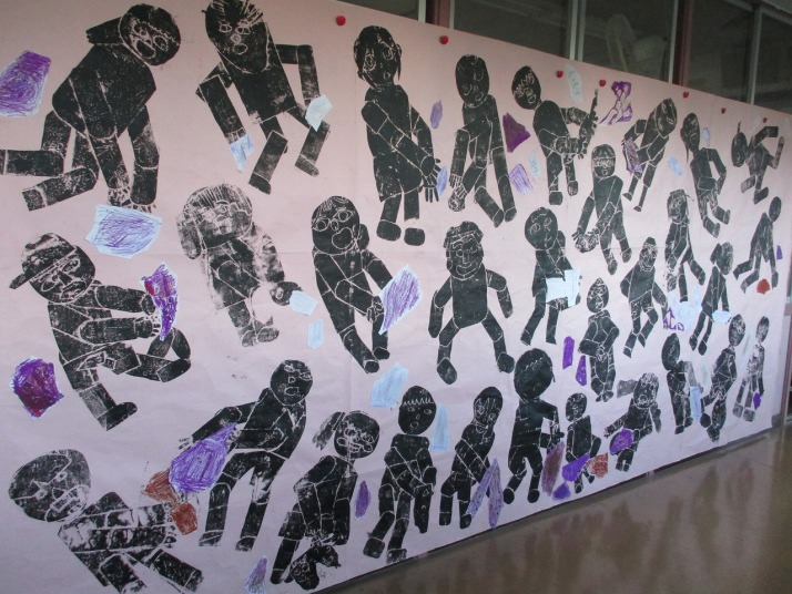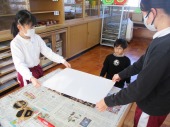 | 12月10日(水) 版画を刷りましょう 各学年図工の時間に版画に取り組んでいますが、いよいよ印刷に入った学年がありました。特に2年生は、大きな模造紙に一人一人の作品を印刷し、大きなサツマイモ掘りの版画ができていました。 |